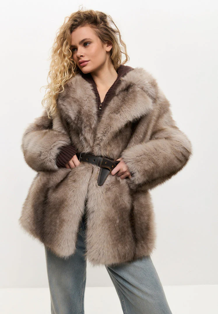 Discover the perfect blend of elegance and warmth with this grey faux fur coat. Designed for fashion-forward women, this coat features a soft faux fur texture, a flattering belted waist, and premium quality. Ideal for elevating your winter wardrobe, this coat combines style, comfort, and sophistication. Shop now for luxurious winter fashion.