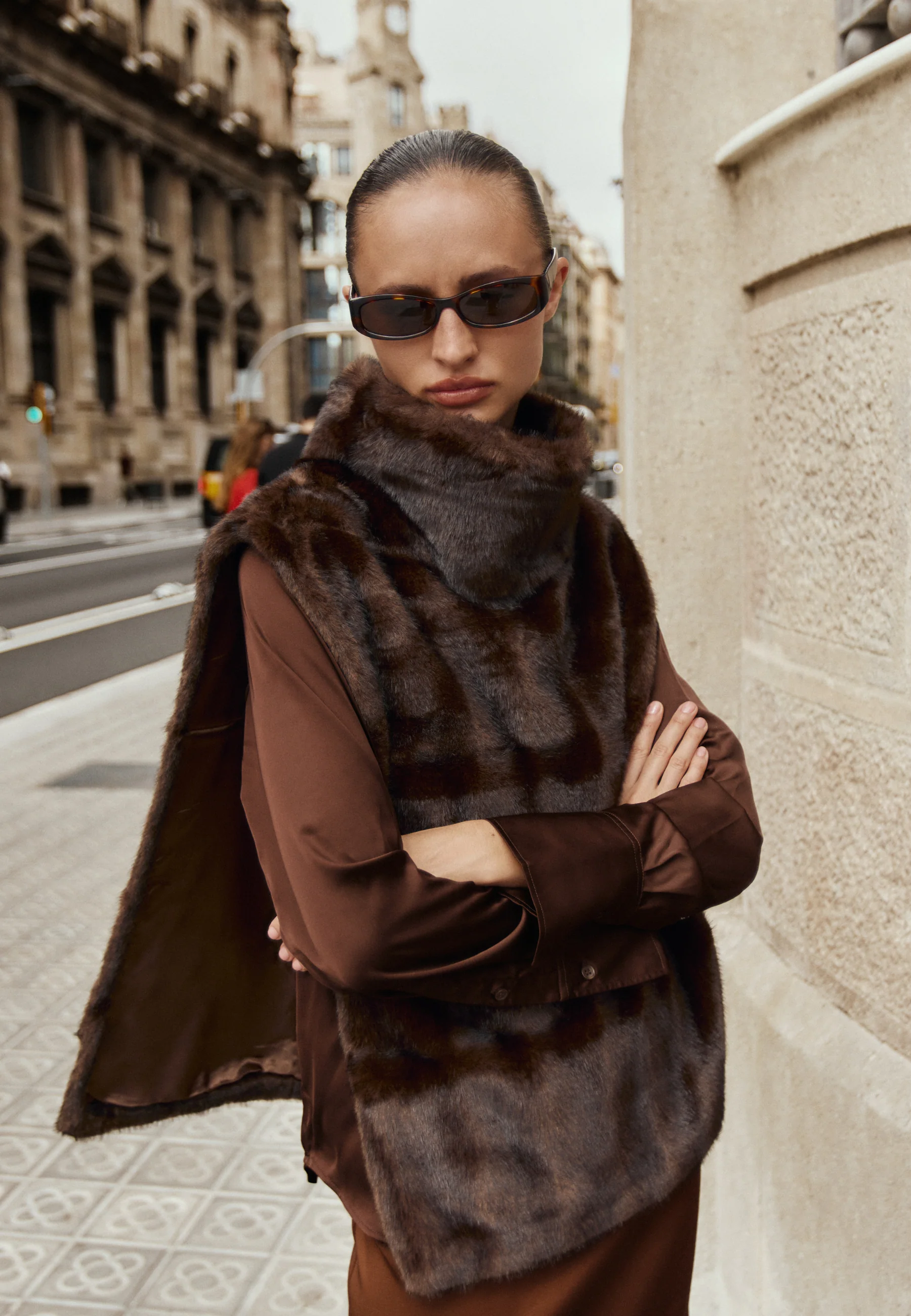 This sleeveless top is crafted in ultra-soft faux fur with a high sculpted turtleneck, offering structure, warmth, and elegance in one bold silhouette. Measuring 60 cm in length, its clean design and luxurious texture make it a standout piece whether worn solo or layered.