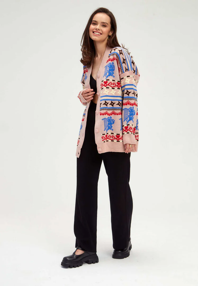 Elevate your wardrobe with this artistic cardigan featuring a unique cupid-themed knit pattern in pastel pink, blue, and red accents. The intricate design is complemented by a button-up front and relaxed fit, making it a perfect choice for layering. This cardigan blends charm with everyday practicality.