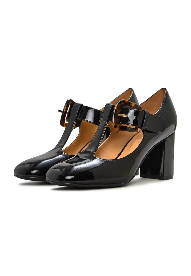 Step into timeless elegance with these vintage-inspired pumps. Featuring a glossy patent leather finish, a chic T-strap design, and a statement tortoiseshell buckle, these shoes bring a sophisticated edge to any outfit. The block heel provides stability and comfort, making them perfect for all-day wear.